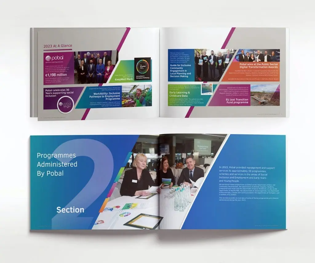 Design Project – Pobal Annual Report 2023. For the second year running, we had the pleasure of working with the communications team in Pobal to produce their Annual Report for 2023. A 128 page report designed in landscape format showcasing the organisations projects, achievements and financial overview. Great work by the Fuzion design team. View more of our design work here