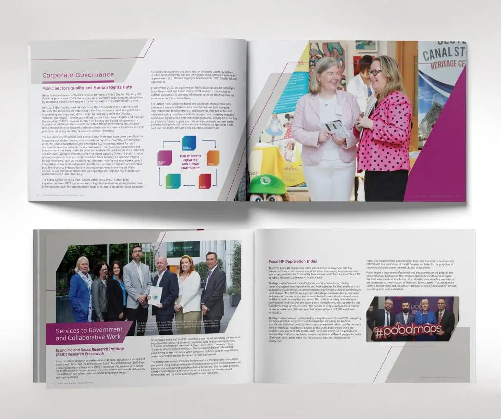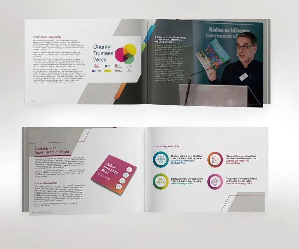 Design Project – Pobal Annual Report 2023. For the second year running, we had the pleasure of working with the communications team in Pobal to produce their Annual Report for 2023. A 128 page report designed in landscape format showcasing the organisations projects, achievements and financial overview. Great work by the Fuzion design team. View more of our design work here